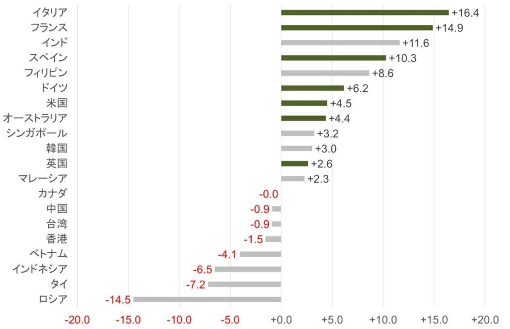 - イタリア: +16.4ポイント (59.5% → 76.0%)