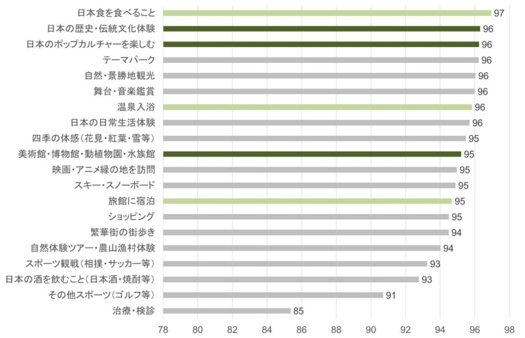 その通りです。実際、観光庁の別のデータ(各アクティビティを体験した人のうち、「満足した」と回答した人の割合)を見ると、「日本食を食べること」は97%、「温泉入浴」は96%と、体験者の満足率そのものは、非常に高いのです。