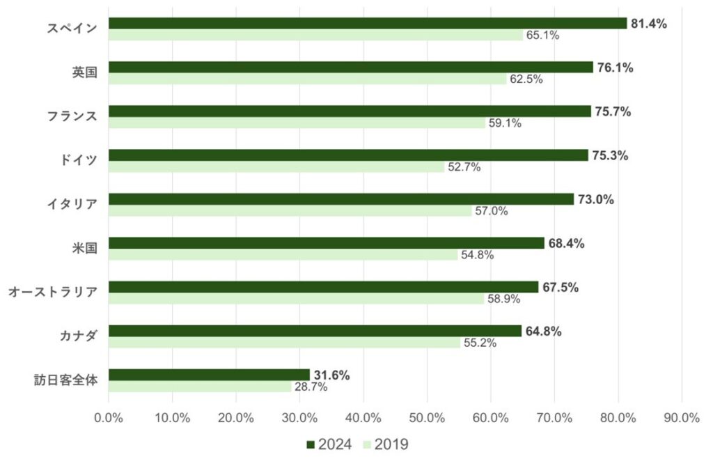 特に、欧米豪からの旅行者の約6〜8割が「日本の歴史・伝統文化体験」を利用しています(観光庁『インバウンド消費動向調査』)。さらに、コロナ前の2019年と比較すると、2024年では軒並みその利用率が大きく上昇しています。